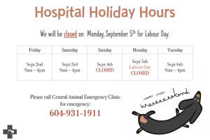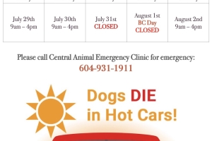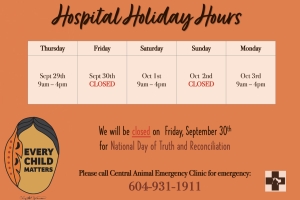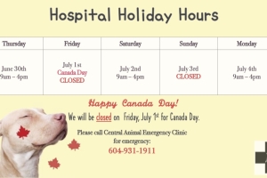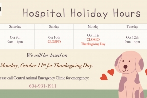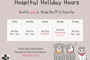 We will be CLOSED on Monday, May 23rd, 2022 for Victoria Day. We will return to our regular COVID-19 hospital hours on Tuesday, May 24th. Please call Central Animal Emergency at 604-931-1911 for any emergencies during our closed hours. We ap...Date2022.05.20 Views2367 -