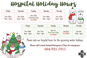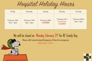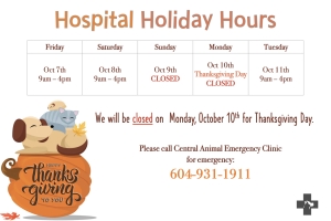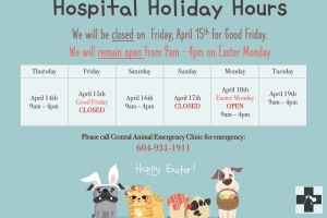 We will be CLOSED on Friday, April 15th, 2022 for Good Friday. We will remain OPEN on Easter Monday during our regular COVID-19 hospital hours. Please call Central Animal Emergency at 604-931-1911 for any emergencies during our closed hours....Date2022.04.14 Views2573 -