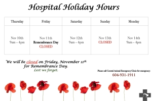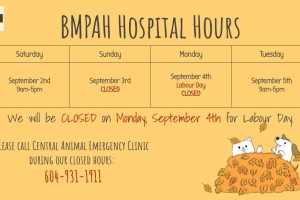 Dear BMPAH Friends & Family, We will be CLOSED on Thursday, November 11th, 2021 in honour of Remembrance Day. We will be back to our regular COVID-19 hospital hours on the following day, Friday, November 12th. Please call Central Animal Emer...Date2021.11.09 Views3376 -
