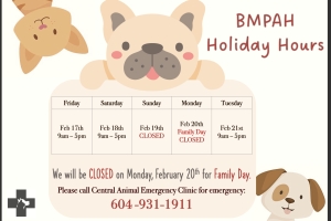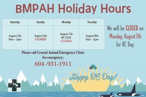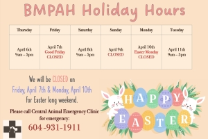 Dear BMPAH Friends & Family, We will be CLOSED on Friday, April 7th for Good Friday. We will remain OPEN on Monday, April 10th on Easter Monday. Please call Central Animal Emergency at 604-931-1911 for emergencies during our closed hours. We...Date2023.03.28 Views3902 -