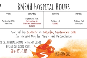 Dear BMPAH friends and family! We will be CLOSED on National Day of Truth & Reconciliation Day, Friday, September 30th. Blue Mountain Park Animal Hospital would like to commemorate this day as a remembrance and for others, a day to generate ...Date2022.09.24 Views4700 -